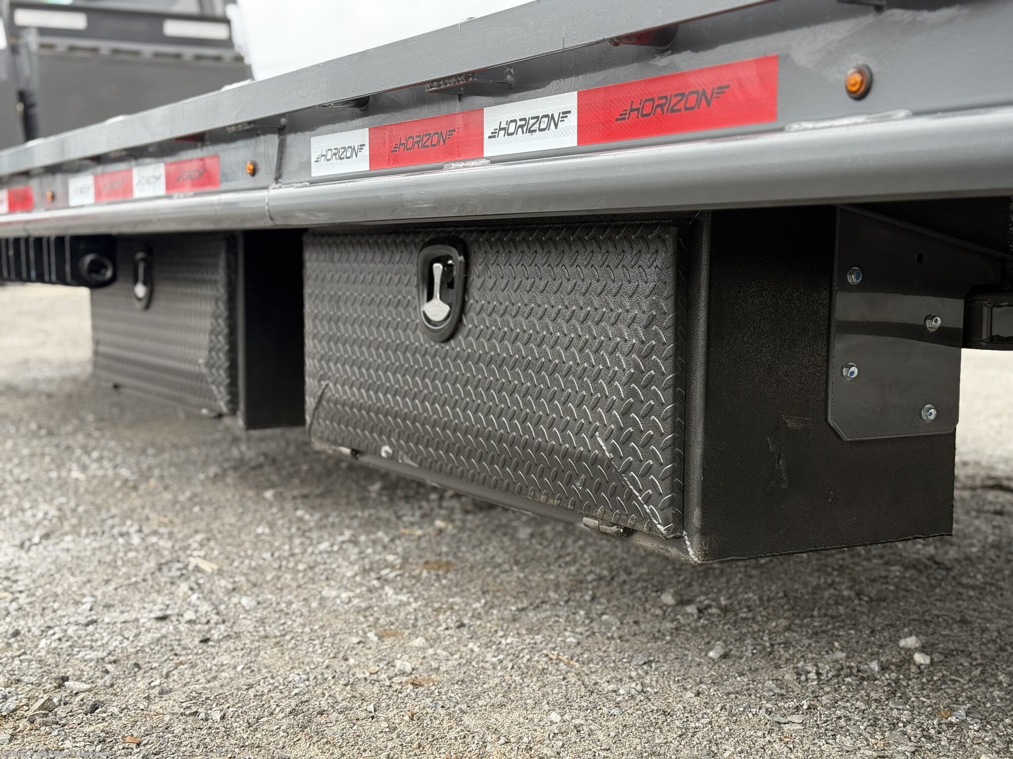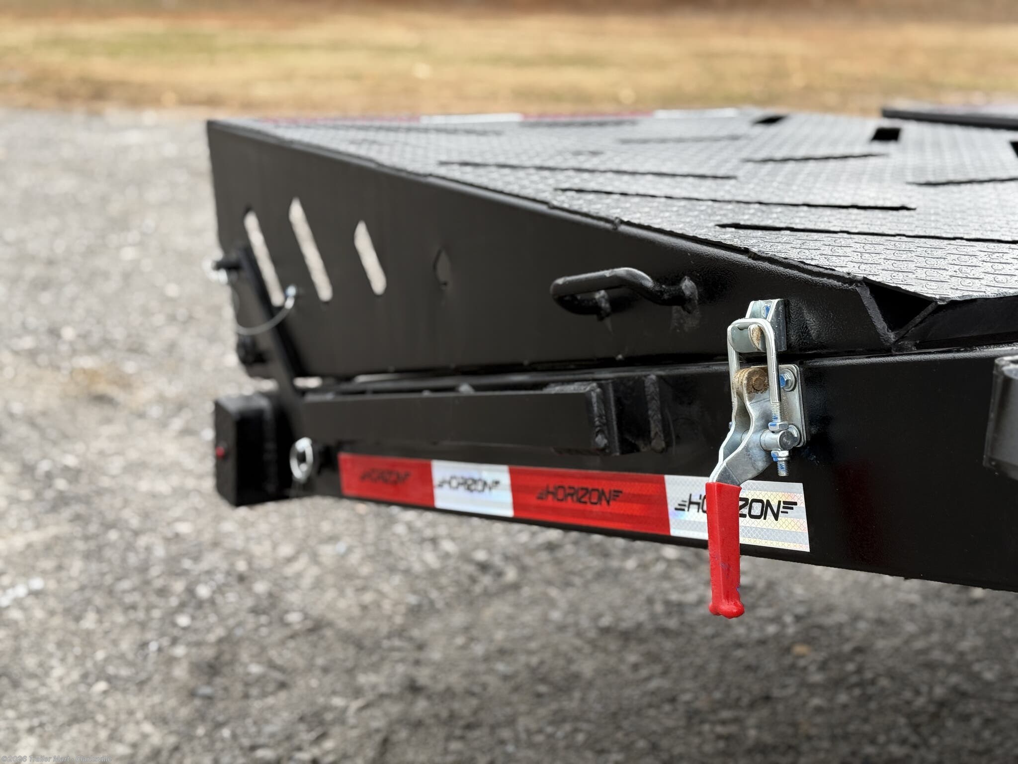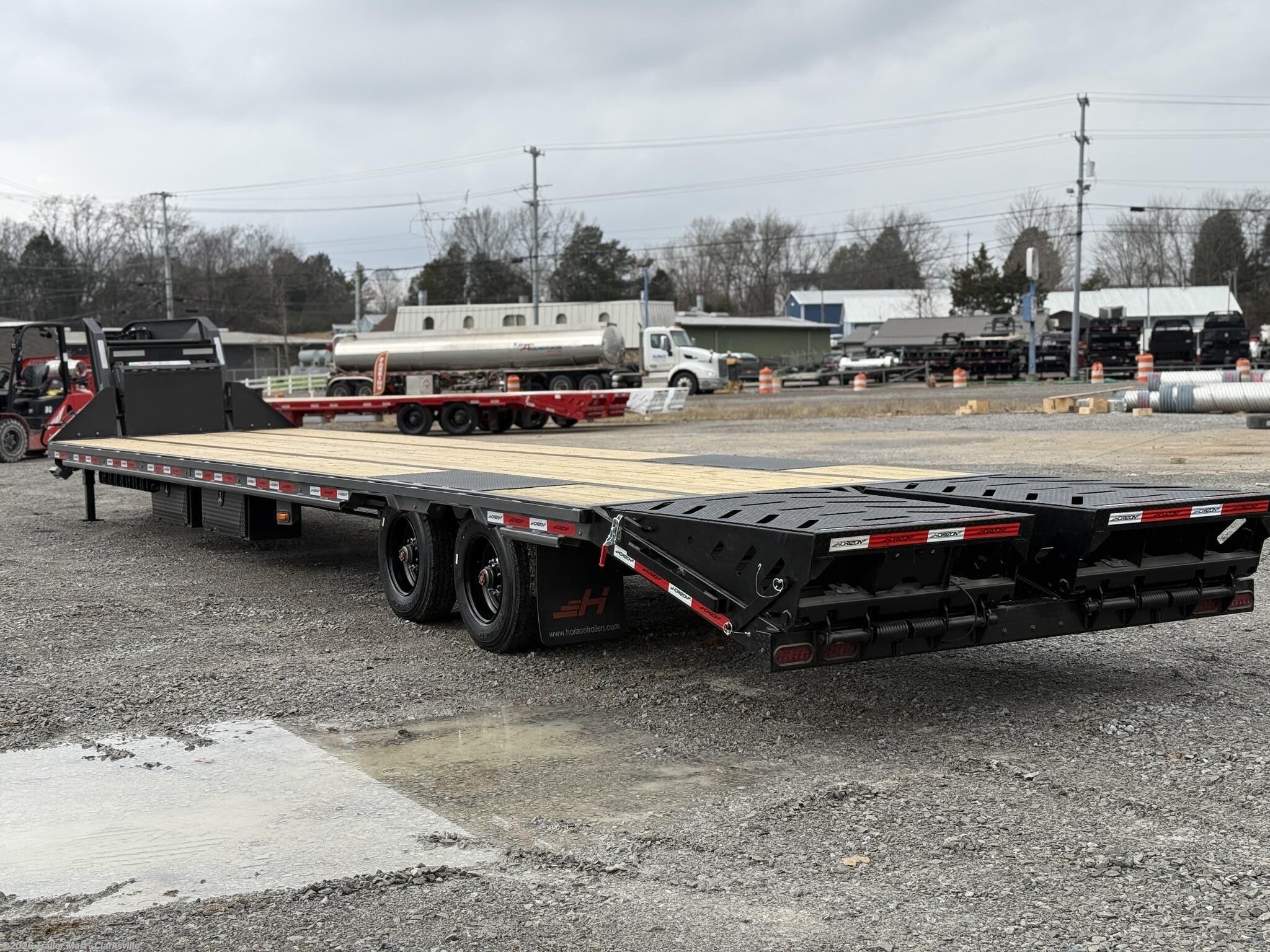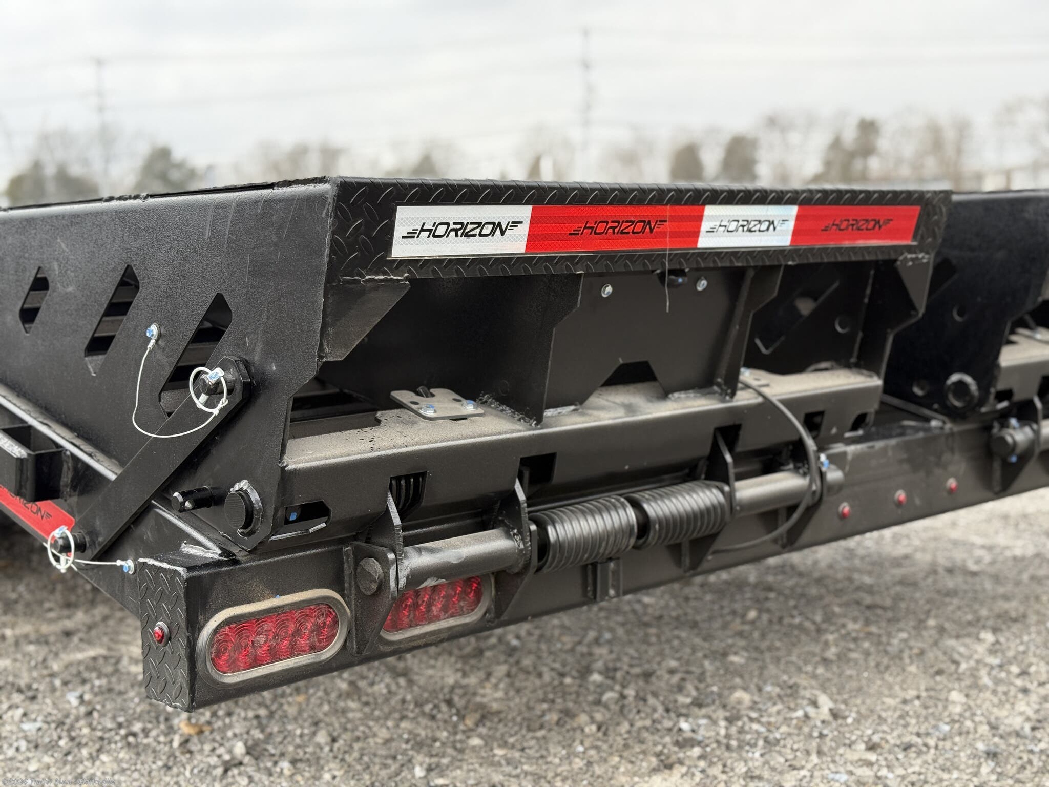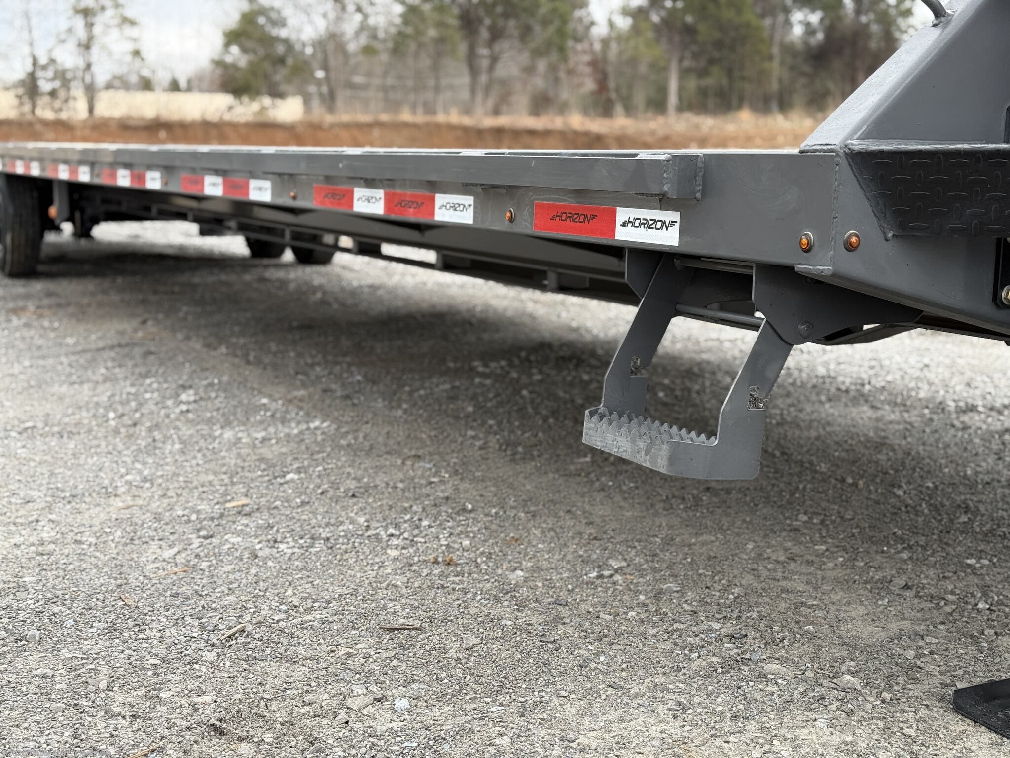 opportunity. The gooseneck tongue is equipped standard with a 30k coupler, dual 12k jacks, eight slide rachets, two side toolboxes, and a full width toolbox with plenty of storage for chains and tools. This unit includes a 5' dovetail, facilitated by dual mountain ramps. Horizon maintains its commitment to quality