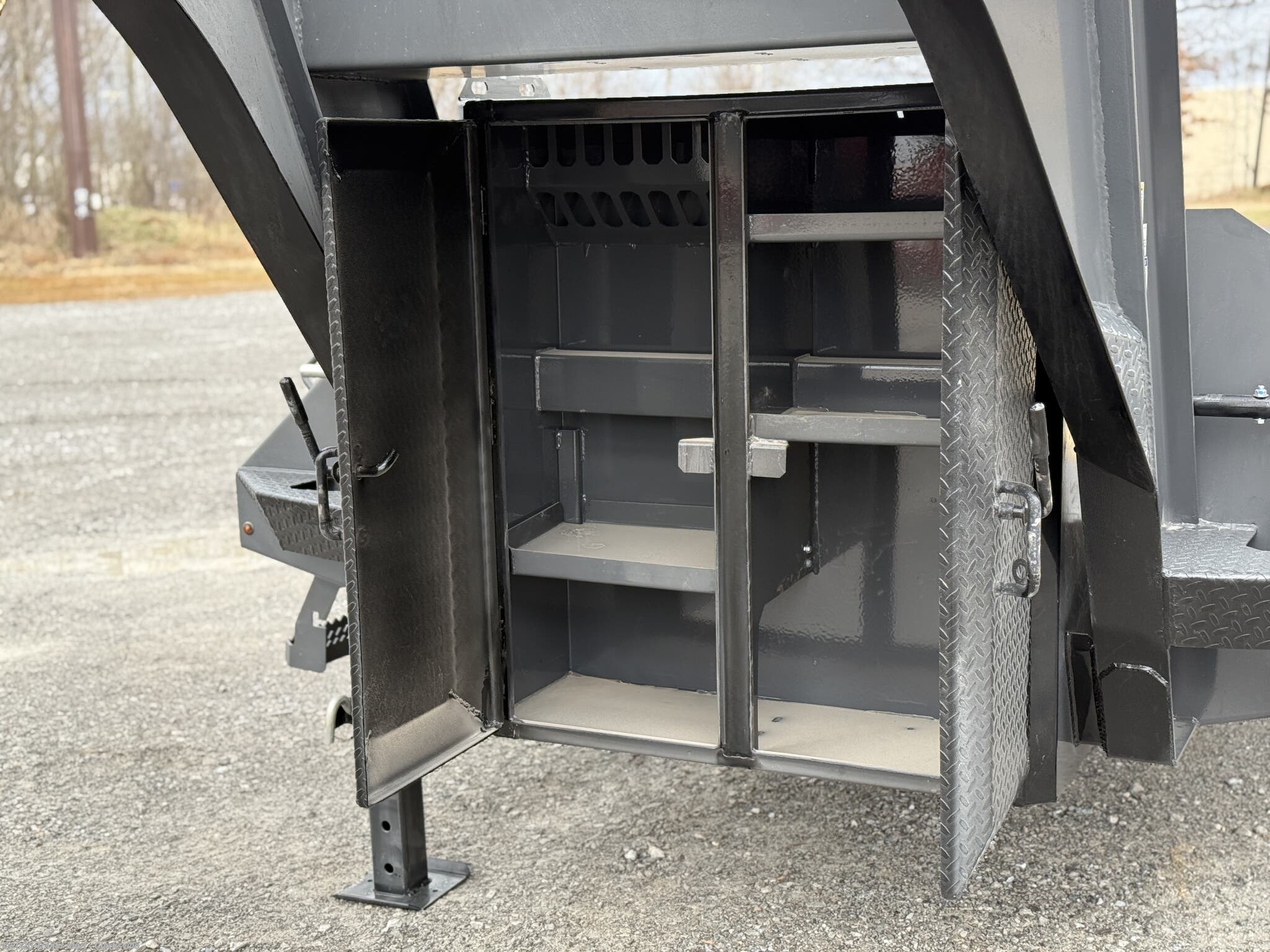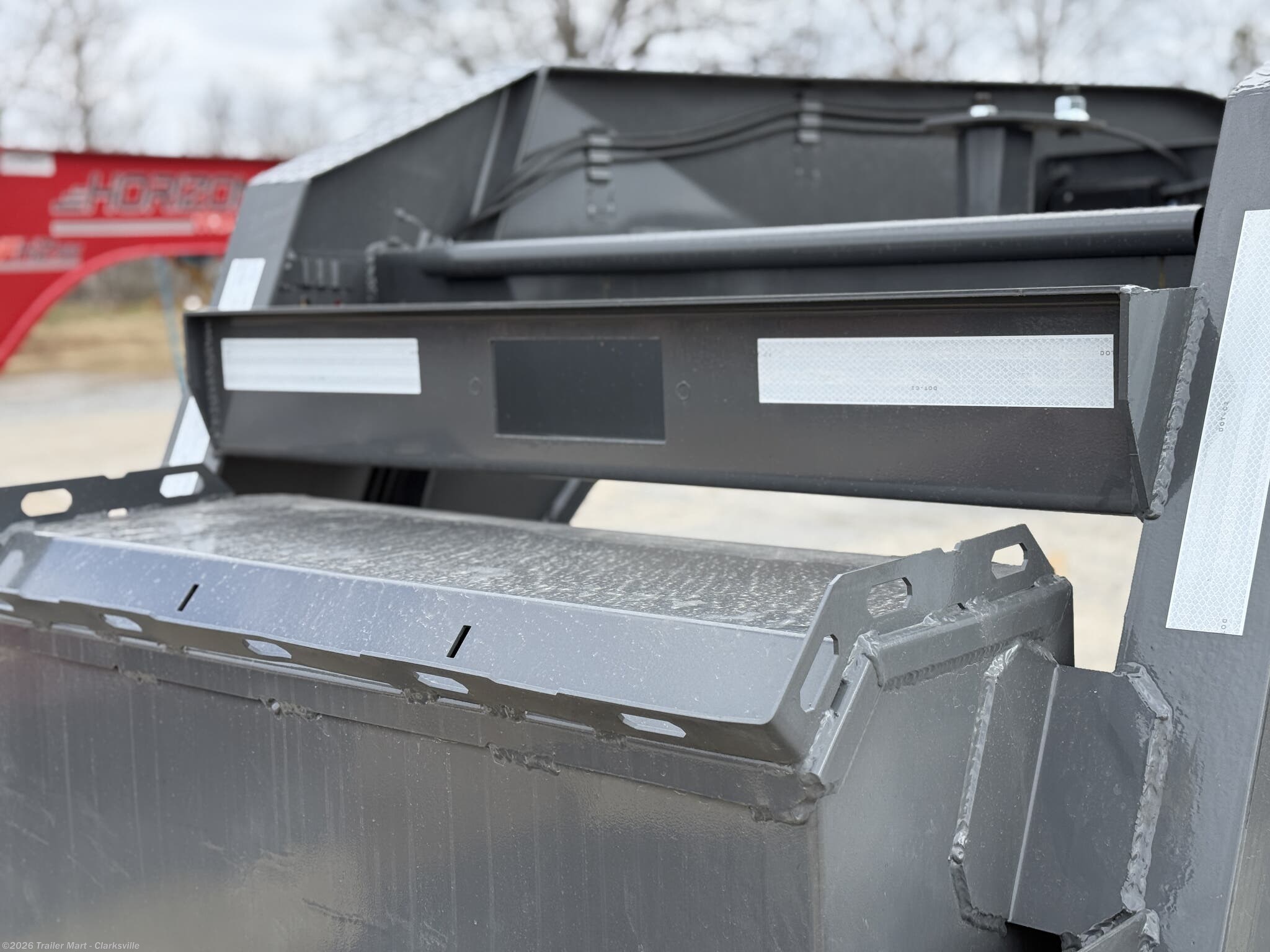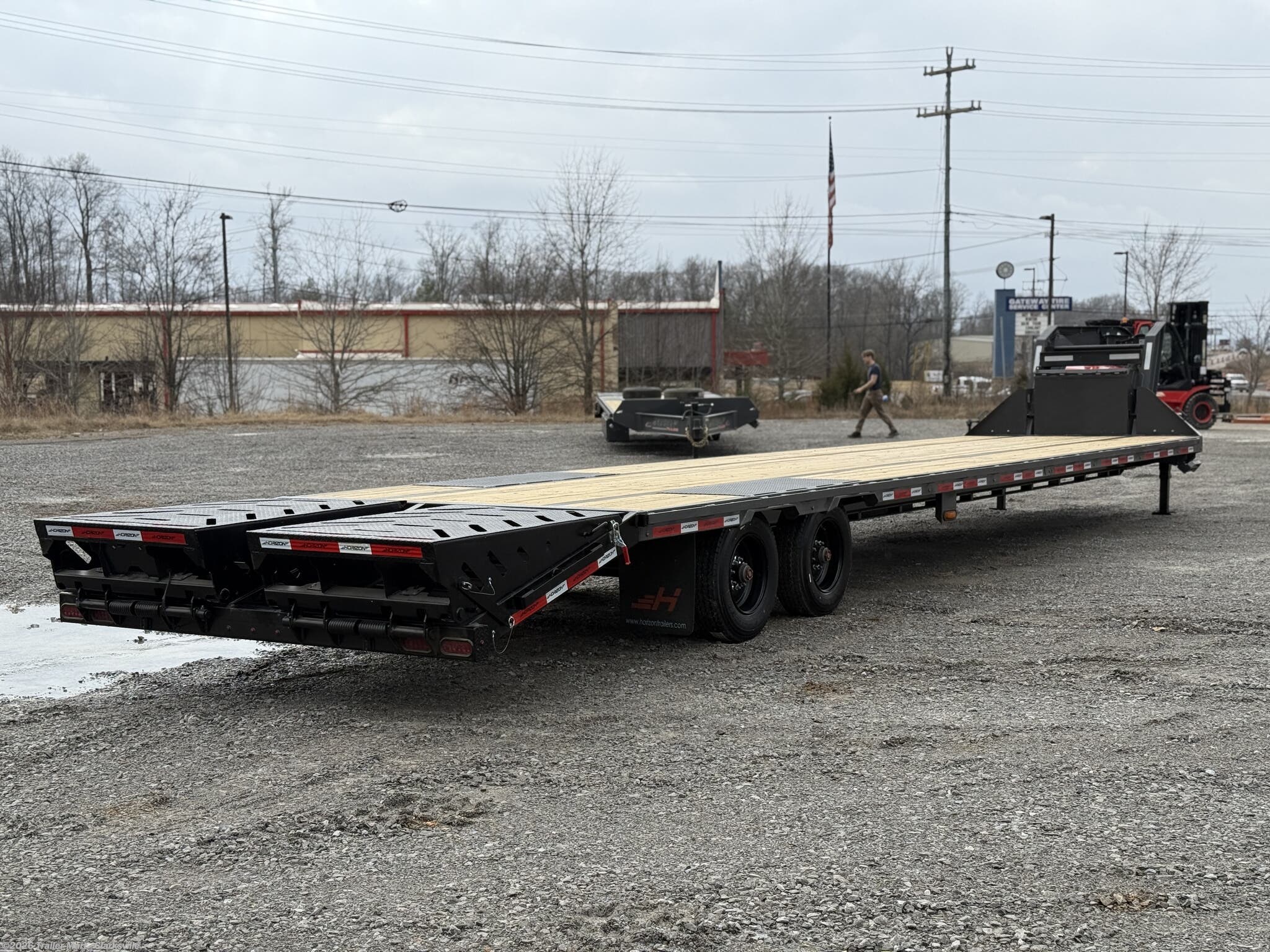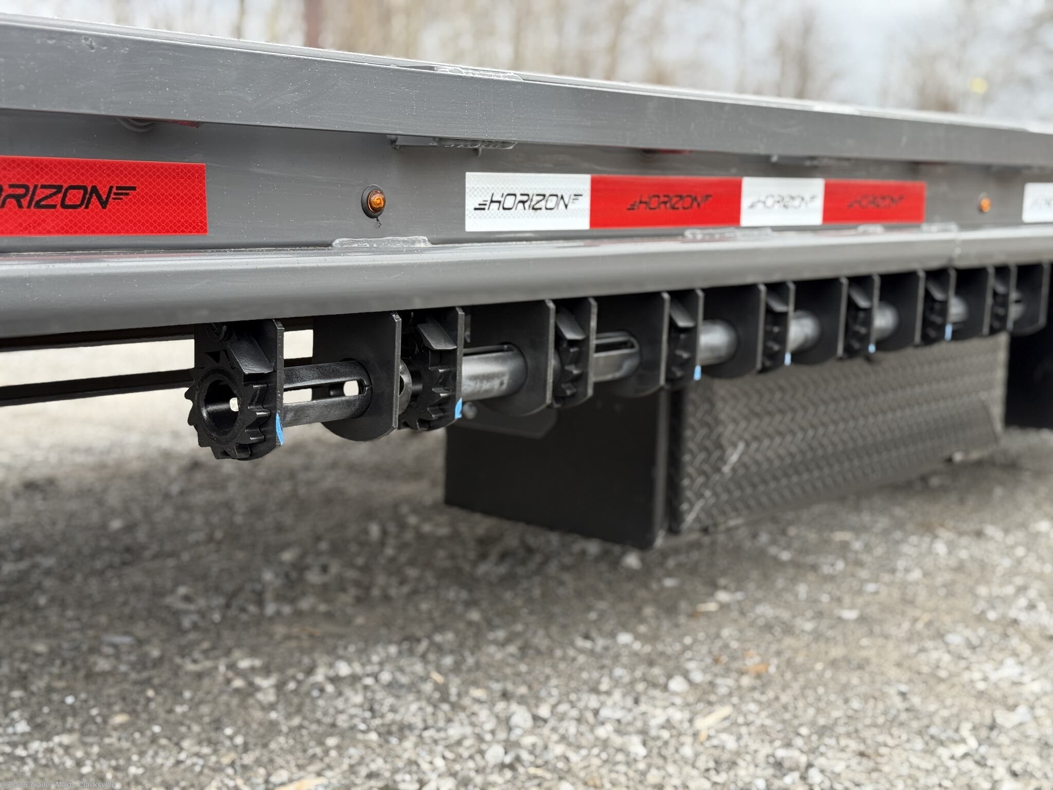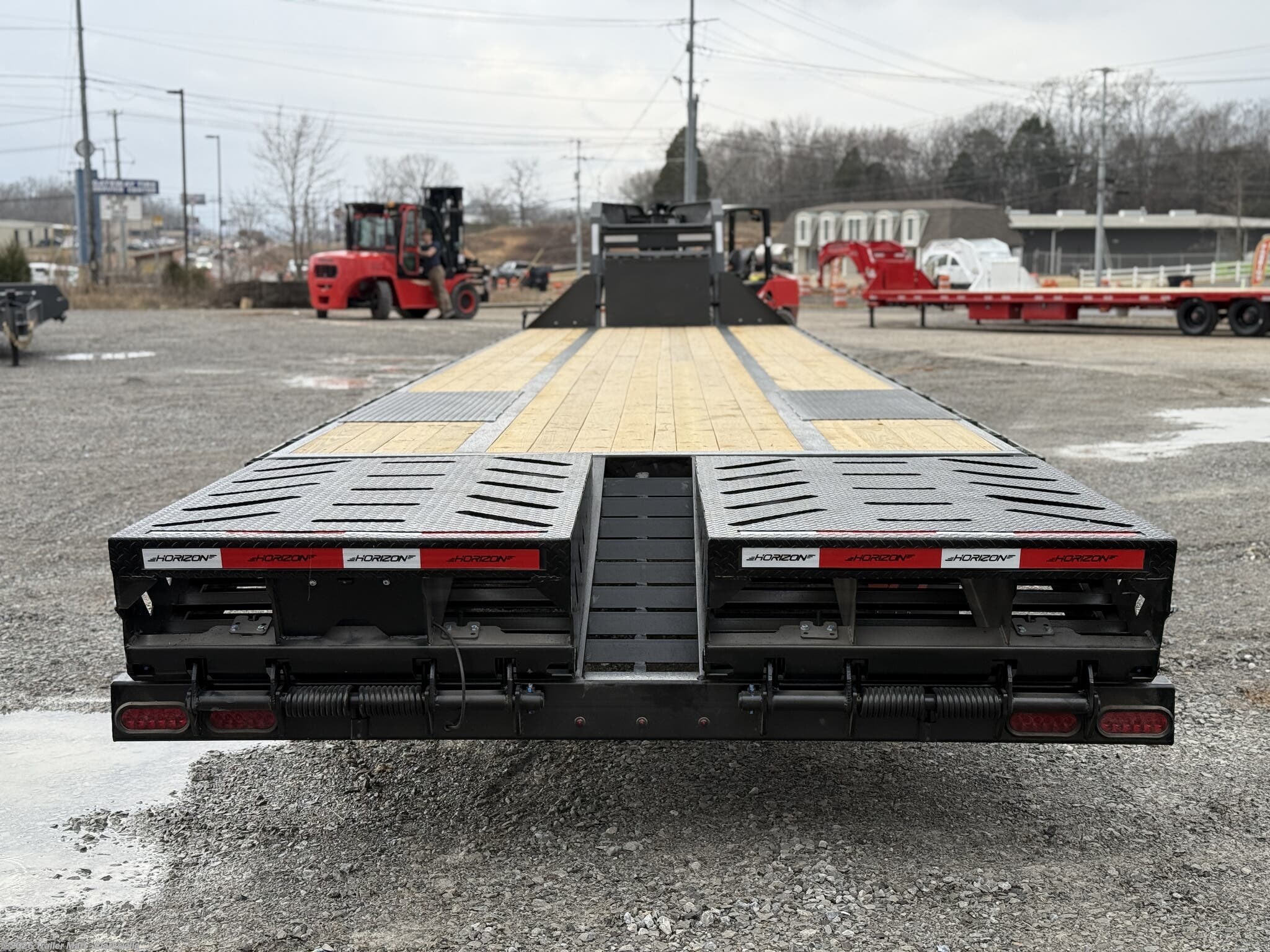 opportunity. The gooseneck tongue is equipped standard with a 30k coupler, dual 12k jacks, eight slide rachets, two side toolboxes, and a full width toolbox with plenty of storage for chains and tools. This unit includes a 5' dovetail, facilitated by dual mountain ramps. Horizon maintains its commitment to quality